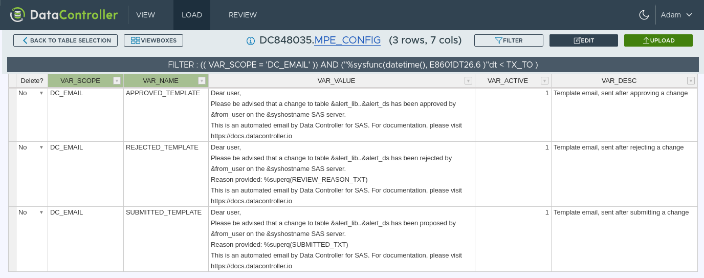 | article | DC Configuration Options | Configuration Options in Data Controller are set in the MPE_CONFIG table and apply to all users. | Data Controller for SAS® Options | /img/mpe_config.png |
